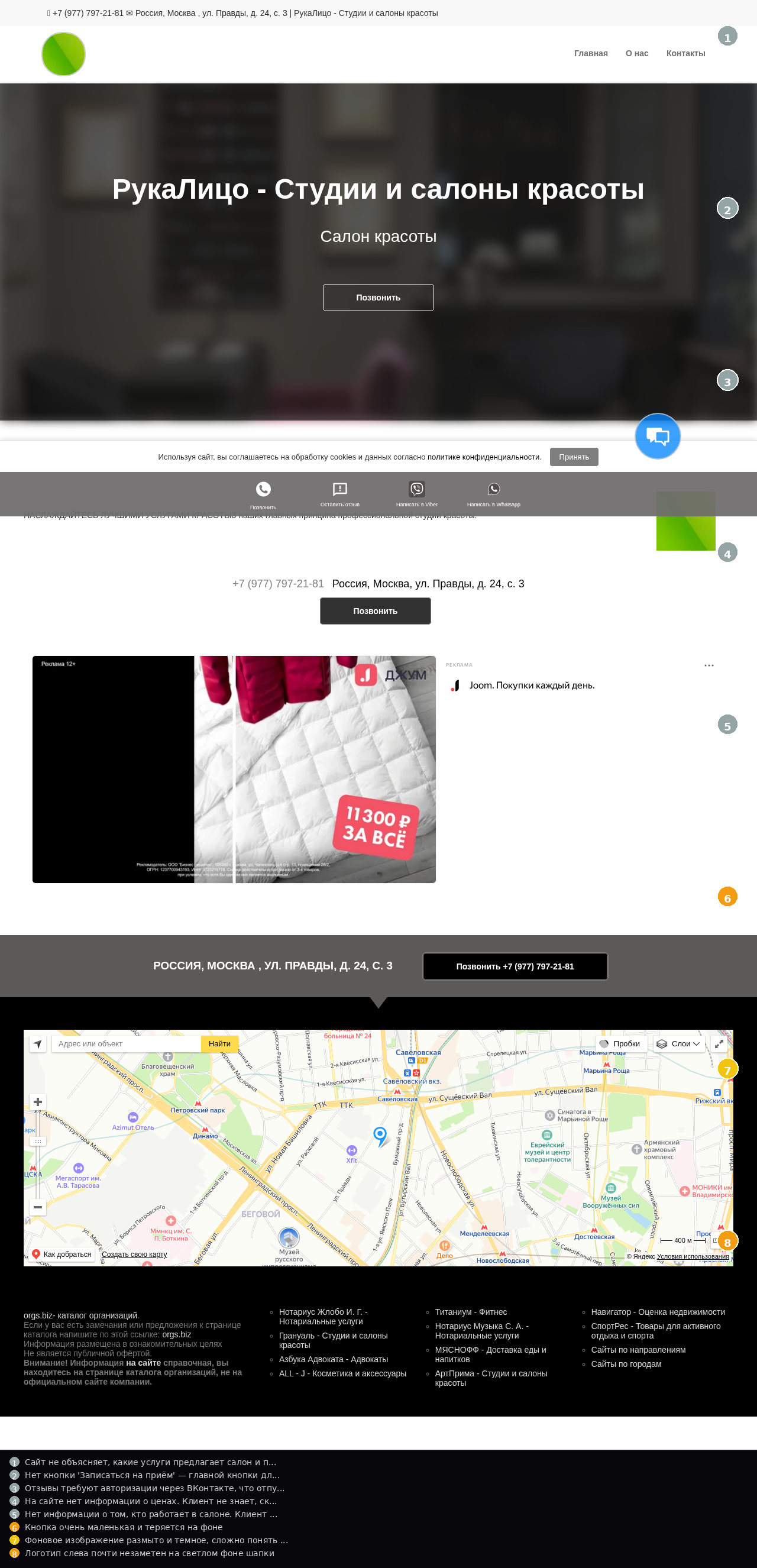 Нет кнопки 'Записаться на приём' — главной кнопки для салона красоты. Есть только 'Позвонить' и 'Оставить отзыв', что не мотивирует клиента действовать.