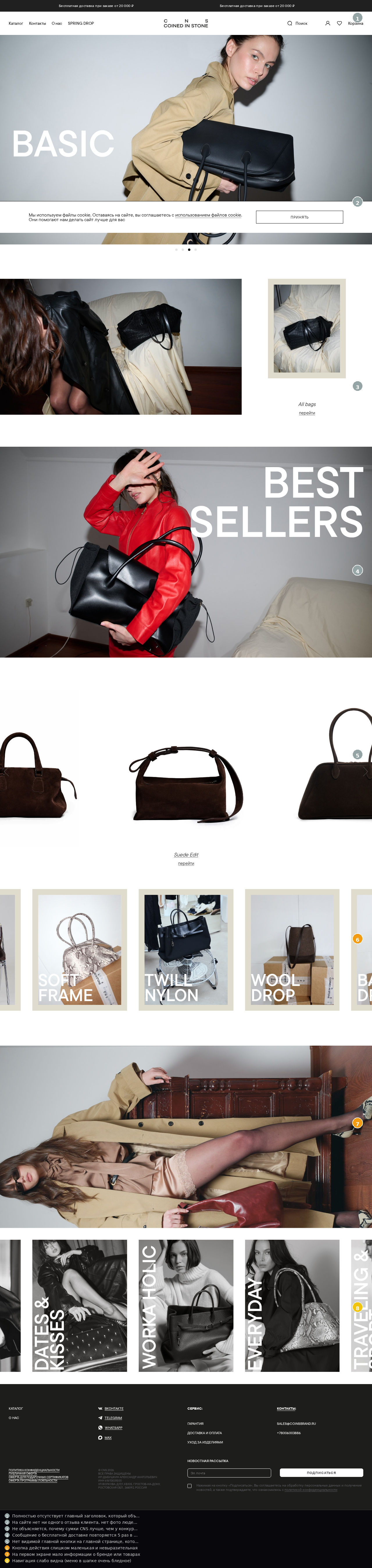 ✓ Собрать 5-10 отзывов от реальных клиентов и разместить их на главной странице. Добавить фото людей с сумками CNS. Написать цифру 'более 5000 довольных клиентов'.