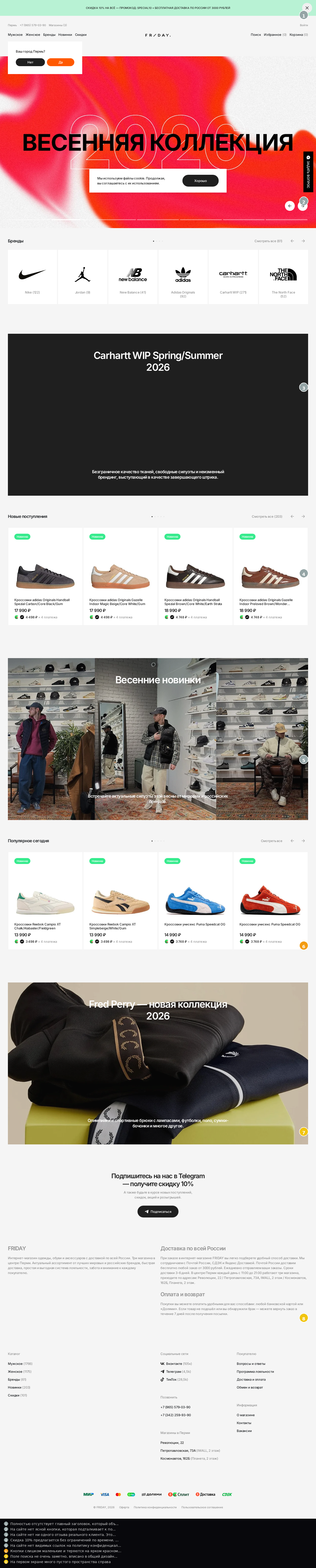 "Главного заголовка нет. На главной странице только логотип 'friday' и текст 'интернет-магазин брендовой одежды, обуви и аксессуаров в перми'"