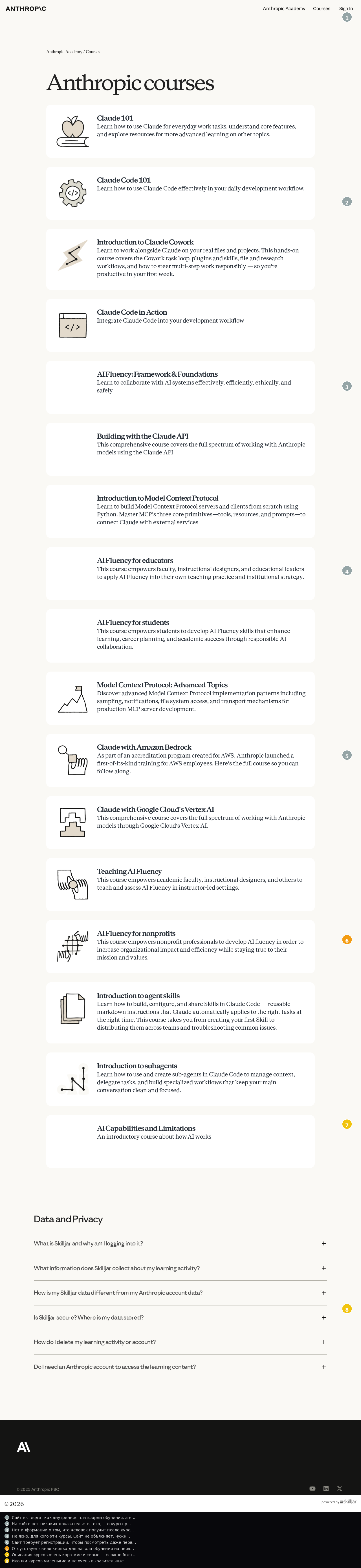 Заголовок 'Anthropic courses' чёткий и читаемый чёрным на белом фоне с хорошим контрастом.