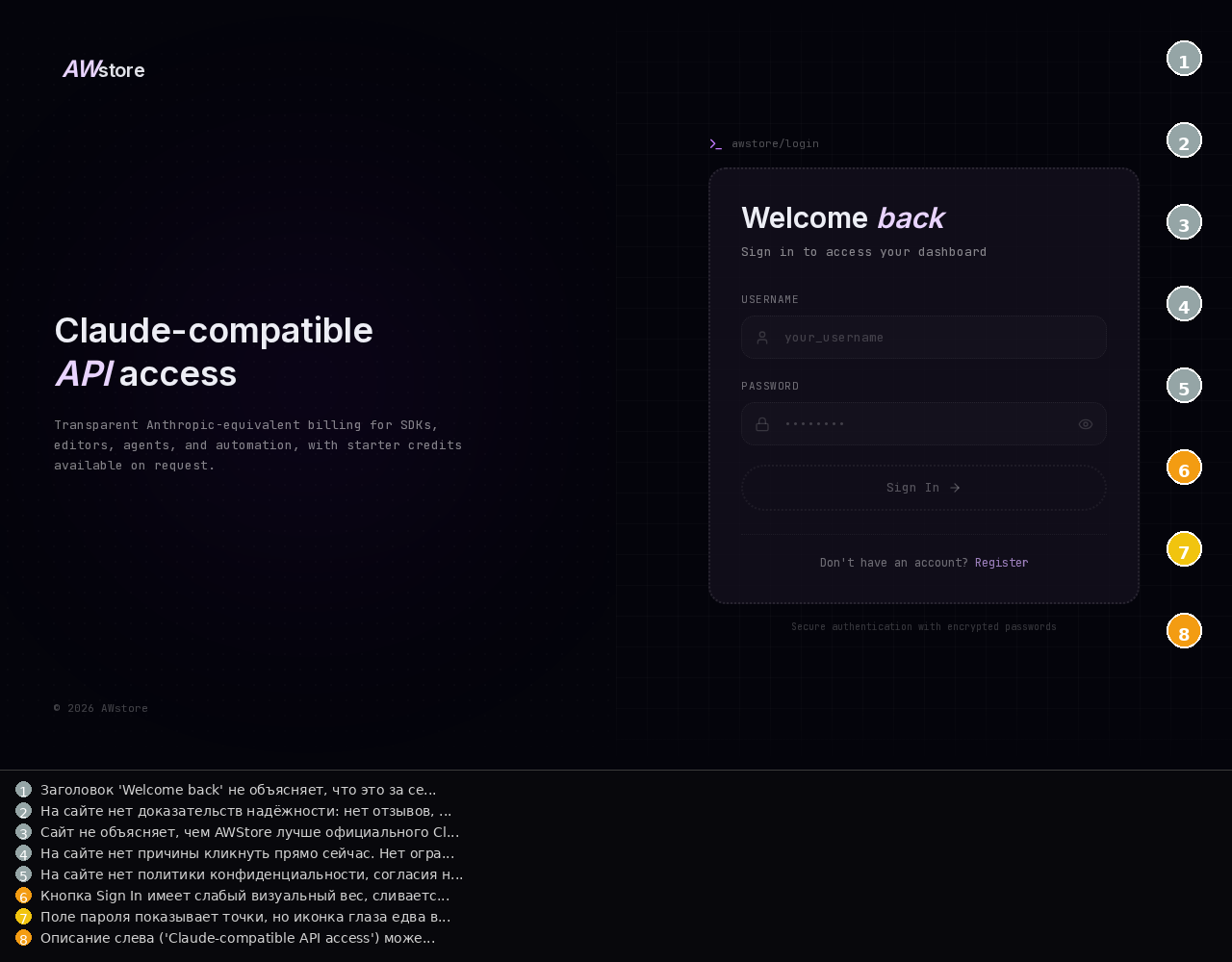 Сайт не объясняет, чем AWStore лучше официального Claude API от Anthropic. Разработчик не понимает, почему платить промежуточнику, если можно пойти напрямую.